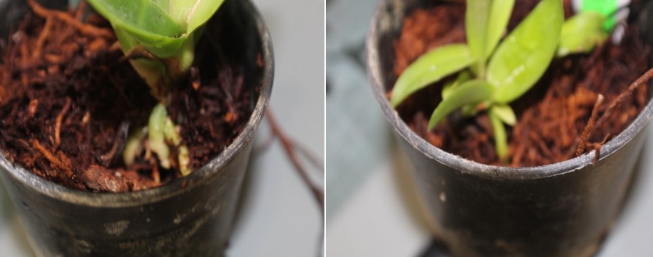 The above photos show the increased root growth on two Cattleya seedlings after 4 months.